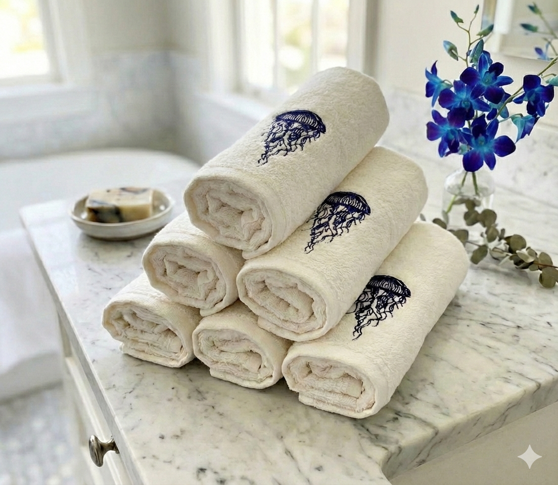 Small gestures of luxury. Soft texture adorned with playful marine motifs.